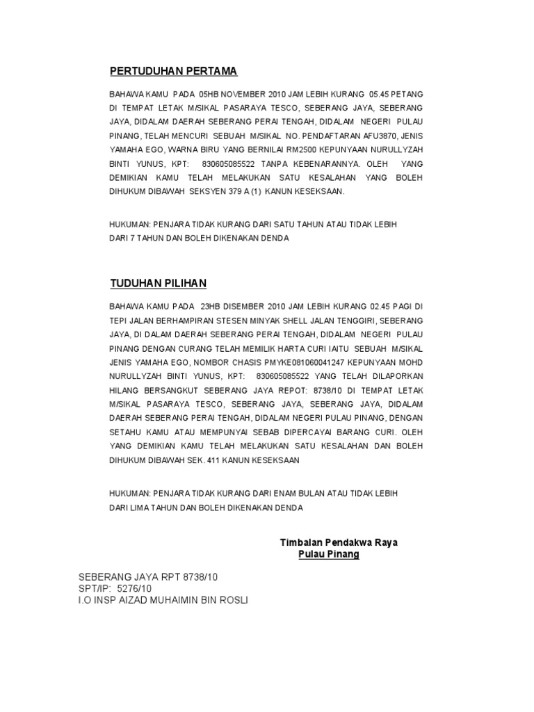 1082022Kes disiasat di bawah Seksyen 379A Kanun Keseksaan katanya. Kesalahan itu dilakukan di lokasi dan masa yang sama seperti pertuduhan pertama. Bagi kesalahan itu tertuduh didakwa mengikut Seksyen 379A Kanun Keseksaan yang memperuntukkan hukuman penjara tidak kurang setahun dan tidak lebih tujuh tahun dan boleh juga dikenakan denda.